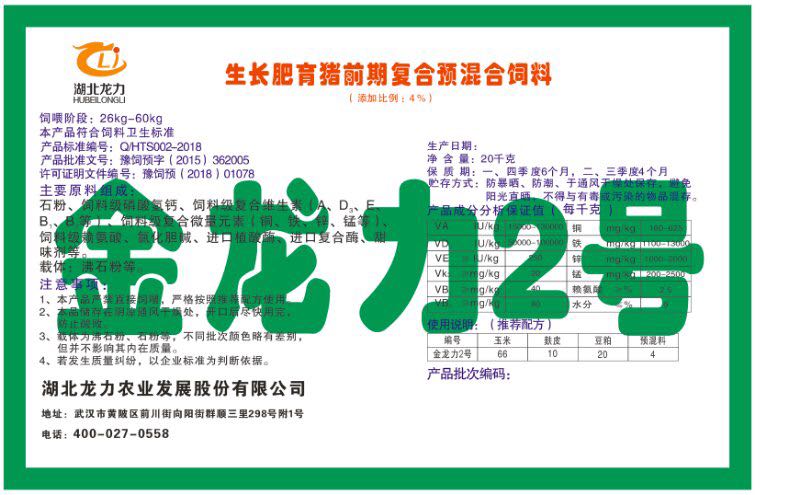湖北龍力農(nóng)業(yè)發(fā)展股份有限公司坐落于武漢市黃陂區(qū)前川街向陽街群順三里298號附1號。公司成立于2014年6月,公司自成立以來把“創(chuàng)全球最大養(yǎng)豬綜合服務(wù)”為企業(yè)愿景。致力于打造教保料品牌”作為公司發(fā)展的明確目標。公司一直致力于豬營養(yǎng)的研究和開發(fā),積極與國內(nèi)外高校和科研機構(gòu)合作,推廣養(yǎng)豬技術(shù)、動物營養(yǎng)新概念,向世界農(nóng)牧企業(yè)學習與合作。公司采用國內(nèi)先進的生產(chǎn)工藝,選擇高精度電子配料秤,高均勻度、無殘留混合機等先進設(shè)備....
